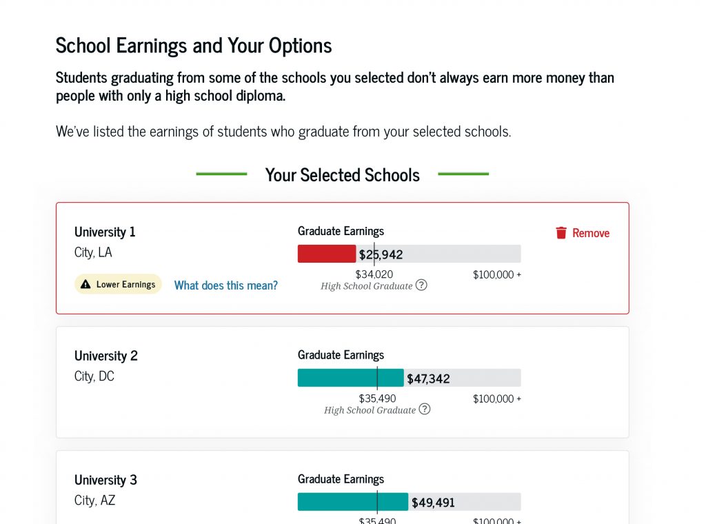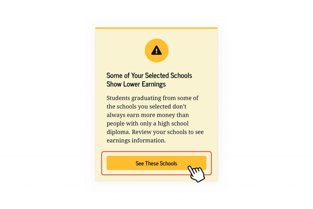 The “lower earnings” alert provides greater transparency for how your school choice may affect your real-world earnings. Earnings are just one factor to consider when comparing schools. Make sure you’re informed before making your final school decision by reviewing all the data available on College Scorecard.