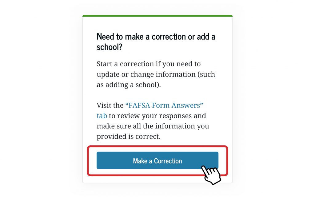 If you find a mistake on your FAFSA form (such as a typo), you can fix it by selecting the “Make a Correction” button on the “FAFSA Form Answers” tab. If you would like to add or remove a school from your FAFSA form, you can also do so by making a correction.