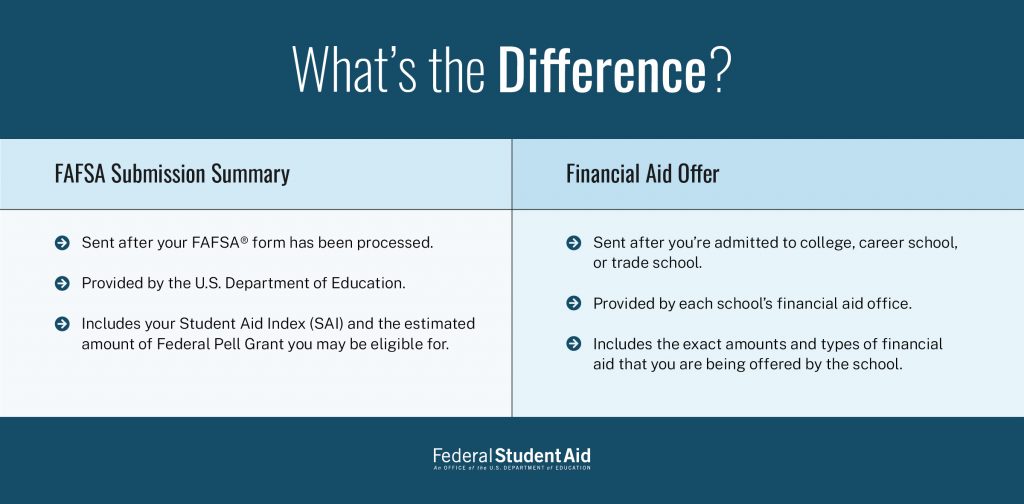 Remember that the aid amount listed on this tab is an estimate and that your SAI is not the amount of money that you or your family is expected to pay for school. You’ll receive your financial aid offer from the school(s) you listed on your FAFSA form after you’re accepted for admission.