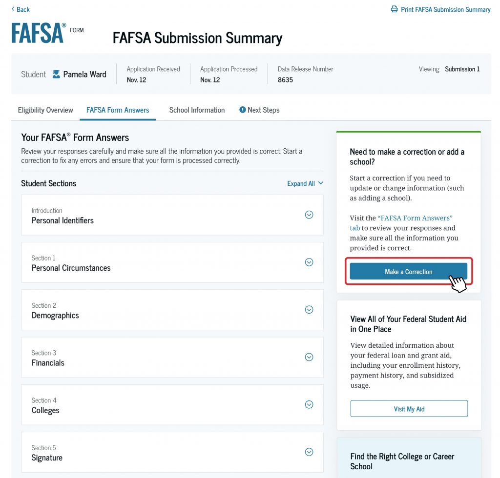 If the comments in the “Next Steps” tab direct you to make a correction, you can start your correction on that tab. Another way to make a correction is from the “Details” page of your processed FAFSA form submission, found on your StudentAid.gov account Dashboard.