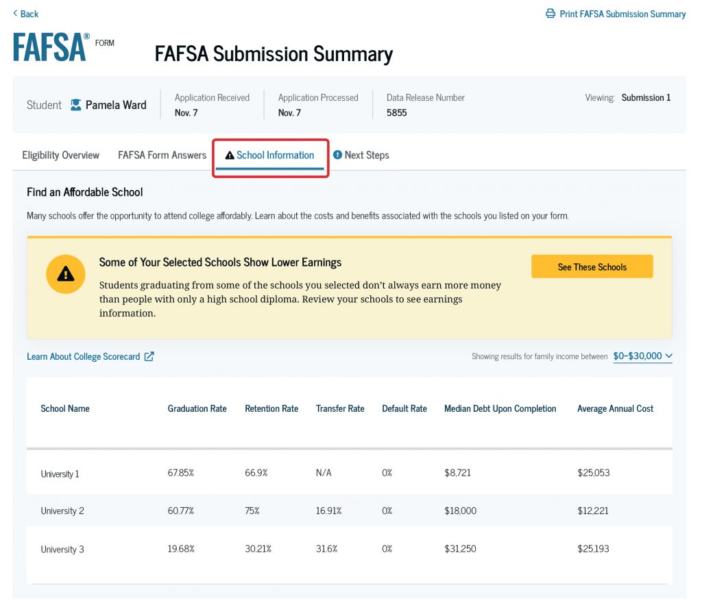 If you’re a first-year undergraduate, career school, or trade school student, you may see a “lower earnings” alert on your FAFSA Submission Summary. You will see this alert only if you selected one or more schools where a graduate’s median earnings are lower than those of high school graduates in the same state, or lower than those of high school graduates nationally (if the school serves primarily out-of-state students).